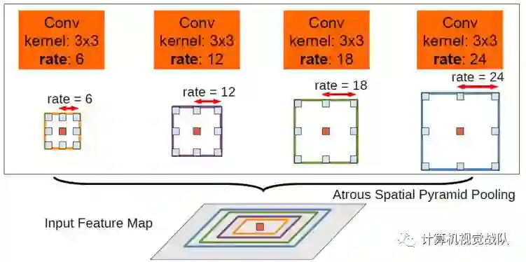 多尺度目标。一般将不同尺度的图像输入DCNN,但计算量增加。作者根据SPP的思想,在给定特征层使用不同的采样率进行重采样,使用具有不同采样率的平行atrous卷积层实现,称为atrous SPP(ASPP)。atrous SPP方法示意图如下图所示:
