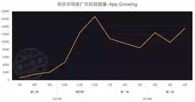 从App Growing的数据来看,拼多多在18年第四季度才开始密集投放在线广告。单看投放数量的话,拼多多仅在2019年前两季度的广告数量,就已超过去年全年投放量。