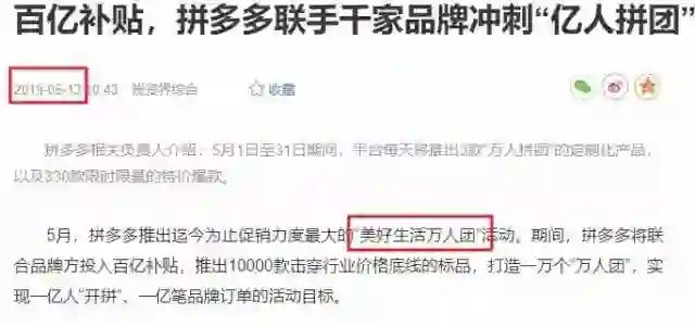 从过往新闻来看,拼多多从5月份就开始狂撒“百亿补贴”了,当时被包装成“美好生活万人团”的形式。转而到6月,又成为618的主力活动。而截止到目前(8月中旬)已持续三个月多,已然超出大家对“年中大促”的认知。