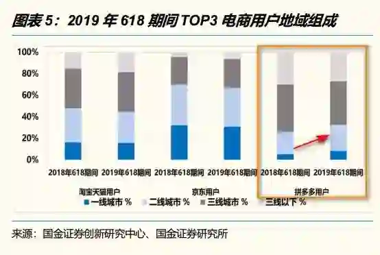 此外,根据券商报告,从2018年618到2019年618期间,拼多多一二线城市用户比例提升明显。拼多多也表示,在今年618期间,70%的农产品订单来自一二线。