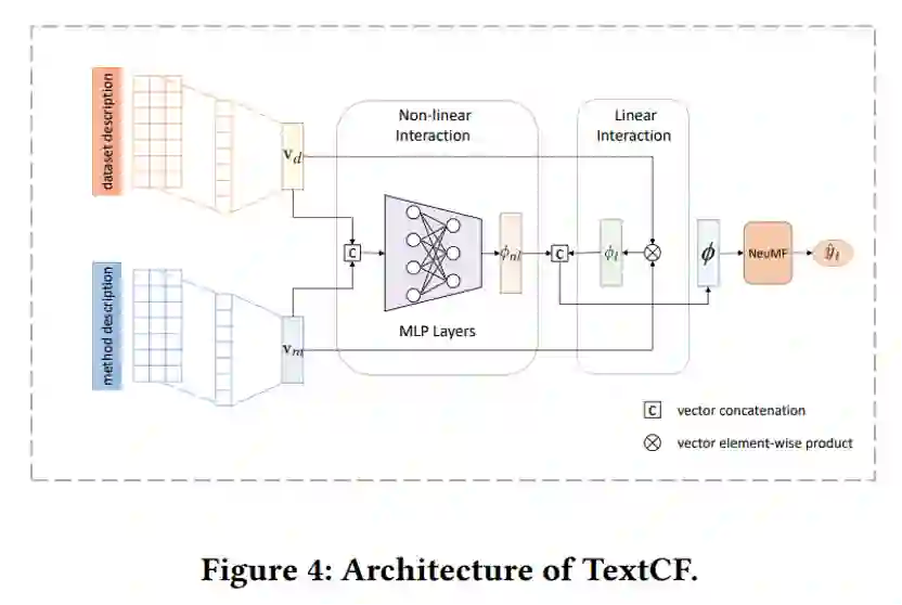 1.图神经网络,它通过允许两个种子(即数据集和方法)实体在知识图上传播来探索高阶连接性,用邻居的信息丰富它们自己的表示2.基于深层文本的协同过滤网络,通过从描述特征中捕捉线性和非线性交互,得出基于文本的交互概率。