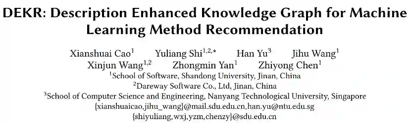 面对大量的机器学习(ML)方法,为给定的数据集和任务选择合适的方法是一个挑战。一般来说,ML方法或数据集的名称相当简洁,缺乏具体的解释,ML实体之间丰富的潜在关系没有得到充分的探索。在本文中,我们提出了一种基于描述增强的机器学习知识图谱的方法DEKR,来为给定的ML数据集推荐合适的ML方法。所提出的知识图谱(KG)不仅包含实体之间的连接,还包含数据集和方法实体的描述。DEKR将结构信息与知识图谱中实体的描述信息相融合,是一个深度混合的推荐框架,融合了基于知识图谱和基于文本的方法,克服了以往基于知识图谱的推荐系统忽略描述信息的局限性。