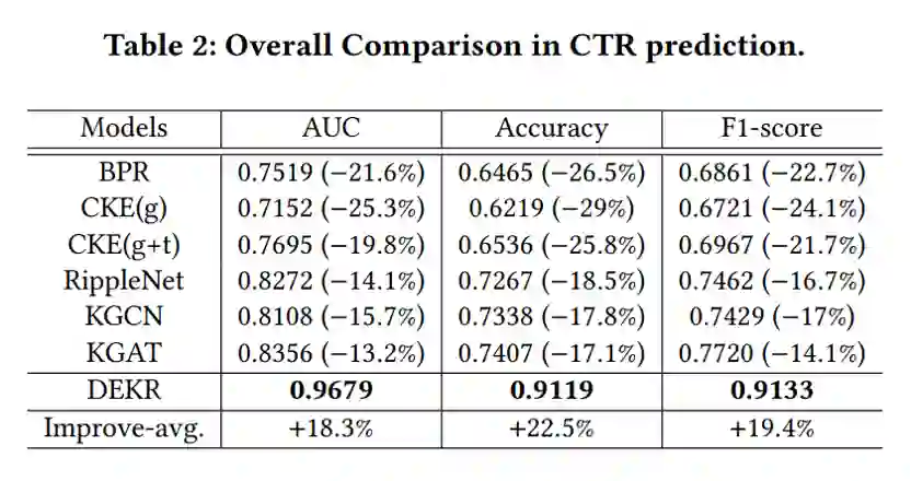 DEKR在CTR预测任务上的表现优于所有baseline模型,平均提高了15%以上。此外,DEKR在top-𝐾 任务上也表现出色。同时几乎所有基于知识图谱的模型都在推荐任务上优于传统模型,这表明在知识图谱中引入丰富的关系和信息极大地提高了推荐的有效性。