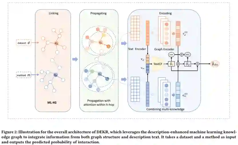 在本文中,我们提出了一个基于描述增强知识图谱的机器学习方法推荐系统DEKR,它可以为给定的机器学习数据集推荐合适的方法。我们构建了一个描述增强的机器学习知识图谱,定义了图谱中的主要实体和关系,并添加了与推荐任务相关的两个核心实体(即数据集和方法)的描述信息。DEKR有两个关键组成部分: