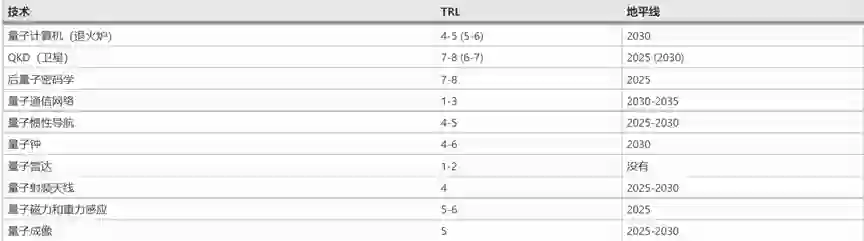 表 1 TRL 和时间范围预期。这些期望反映了一般 TRL 而不仅仅是军事 TRL。请注意,各种量子技术在同一应用程序中处于不同的 TRL