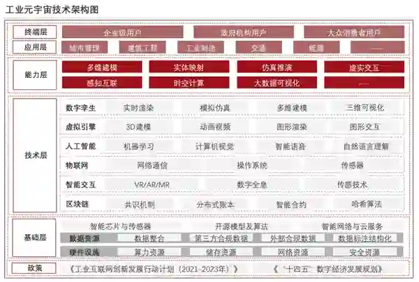 技术架构:在政策规划支撑下,工业元宇宙的技术架构链条逻辑上分为基础层、技术层、能力层、终端层、应用层五大板块。其中核心技术层涉及多类技术群的融合和创新并集成于平台,实现工业相关领域深度赋能。