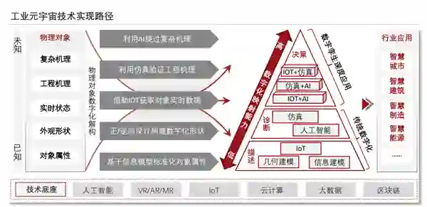 其中,智能网络、大数据、人工智能、云计算、区块链等相关基础技术是工业元宇宙的技术底座;感知互联、实体映射、多维建模、时空计算、仿真推演、可视化、虚实交互七个数字孪生相关技术构成了工业元宇宙的关键技术体系。