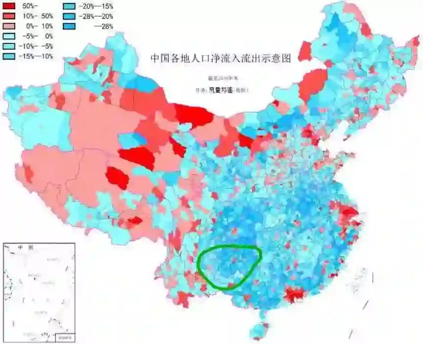 *绿色框住部分为贵州大致区域。红色为流入,蓝色为流出,深色为流入流出率高,淡色为流入流出率低。