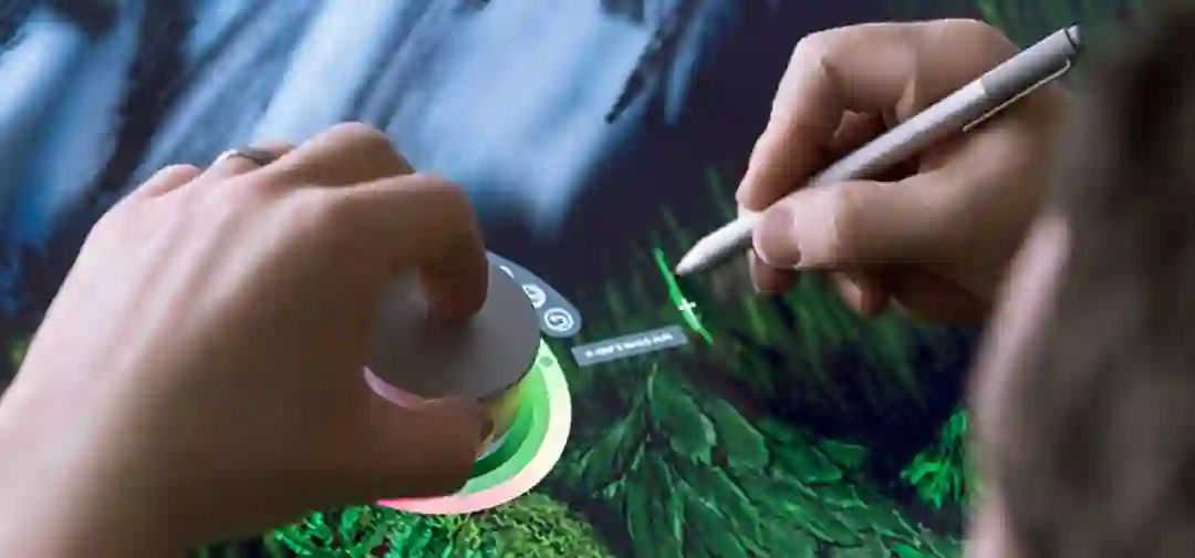 再比如,Touch n' talk演示中,罗老师演示了点按PPT上的文字后通过语音改颜色的功能,从头到尾就是红色、蓝色、绿色三种颜色切换,不知道Smartisan Office定义了多少种颜色名称,想必普通用户除了红橙黄绿青蓝紫外也说不出几个颜色名称了,正好,完美适配Touch n' talk的交互。相比之下,同样的是调整颜色,微软则配合Surface Studio推出了Surface Dial,使用旋转的方式展开径向菜单,从色轮中选择颜色