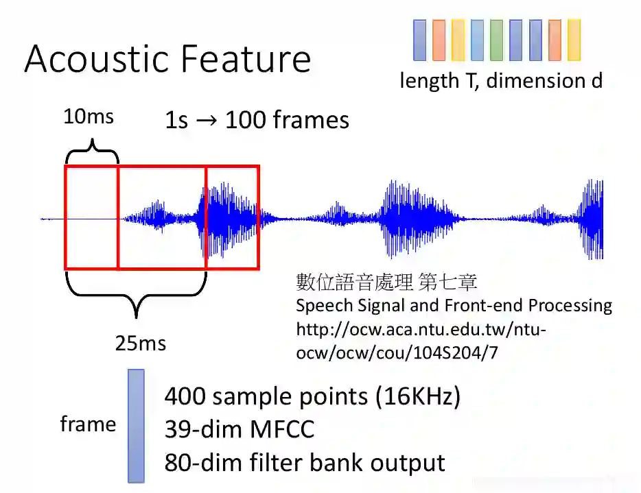 如何将一段语音转换为长度为T,维度为d 的向量,详细可参考《数位语音处理》第七章