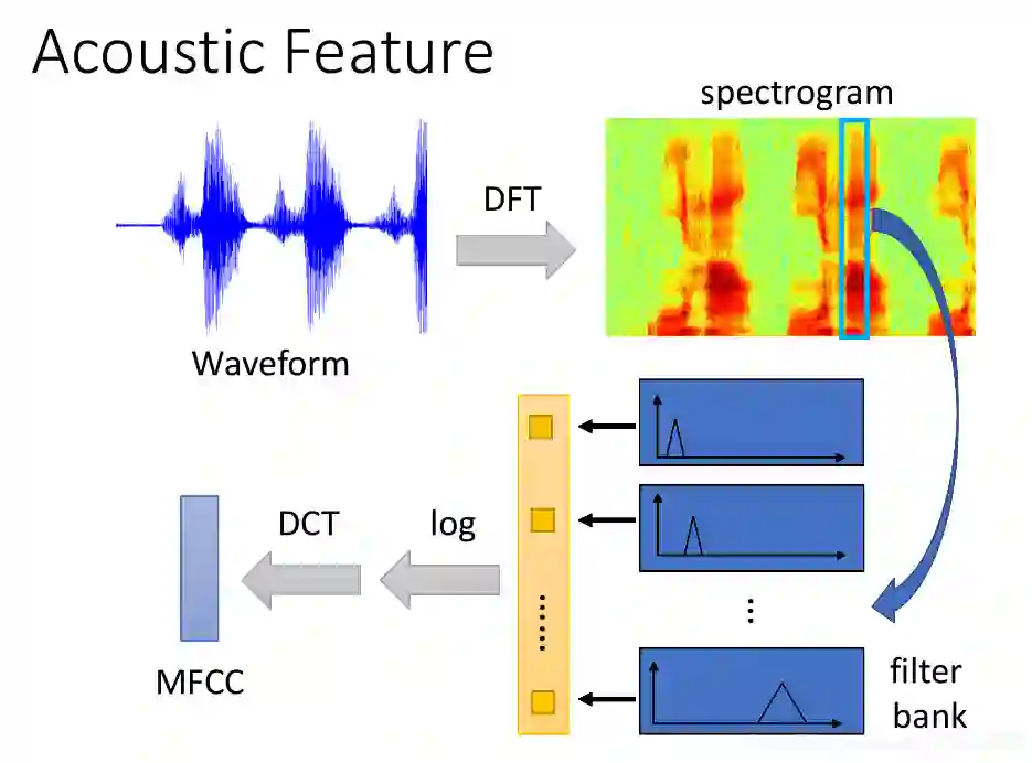 (一个window的音波做DFT (离散傅里叶变换Discrete Fourier Transform)得到spectrogram,这一步很重要,因为声音讯号颇为复杂,同样人听起来一样的声音其声音讯号可能会有大不同,而经过DFT得到spectrogram是与同义的声音讯号有较强的相关性,之后再通过filter bank(根据哺乳类声学器官设计的filter),通常会再取log(log很重要,讯号处理中的log很巧妙),再经过离散余弦变换DCT(Discrete Cosine Transform)得到最终的MFCC)