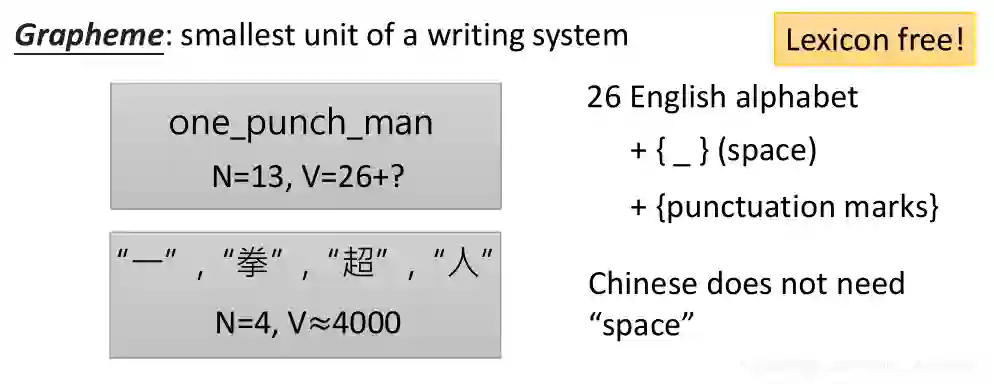可将模型的输出选为phoneme,如读取语音one punch man 输出 W AH N P AH N CH M AE N ,再根据Lexicon(可视为“词汇表”)还原文本,而这个Lexicon是需要一定的语言学家提供,很多语言是找不到Lexicon的Grapheme:the smallest unit of a writing system (书写的最小单位,如英文字母、中文汉字)