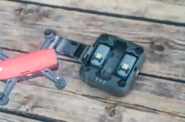 使用充电盒时,先将备用电池插入到两边的电池导轨中,再将飞行器放置于飞行器位置上,合上挡板即安装完成。在移动充电盒右侧有挡板固定锁扣,可防止飞行器掉落。