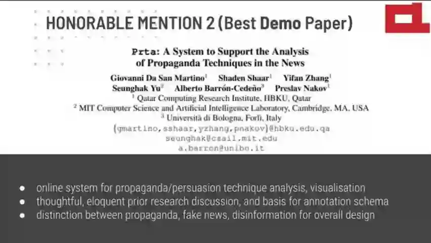 最佳DEMO论文荣誉提名二:Prta: A System to Support the Analysis of Propaganda Techniques in the News(Prta:一个支持分析新闻宣传技术的系统)