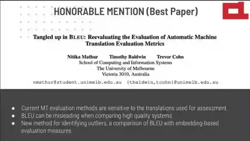 最佳论文荣誉提名二:《Tangled up in BLEU: Reevaluating the Evaluation of Automatic Machine Translation Evaluation Metrics》(深入于BLEU:重新评估自动