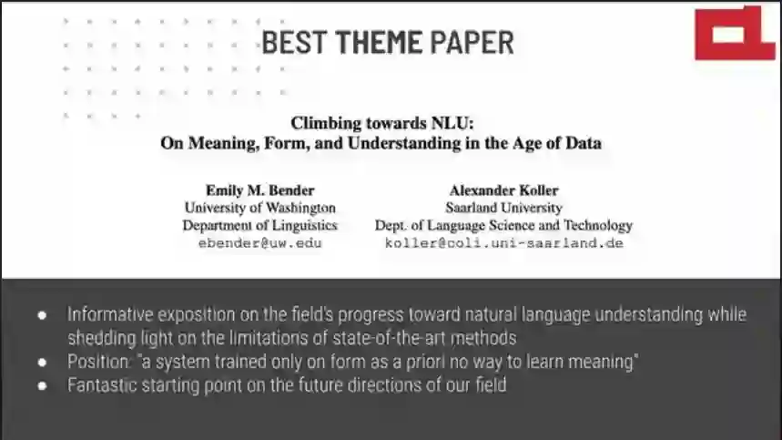 最佳主题论文:《Climbing towards NLU: On Meaning, Form, and Understanding in the Age of Data》(迈向NLU:关于数据时代的意义,形式和理解)