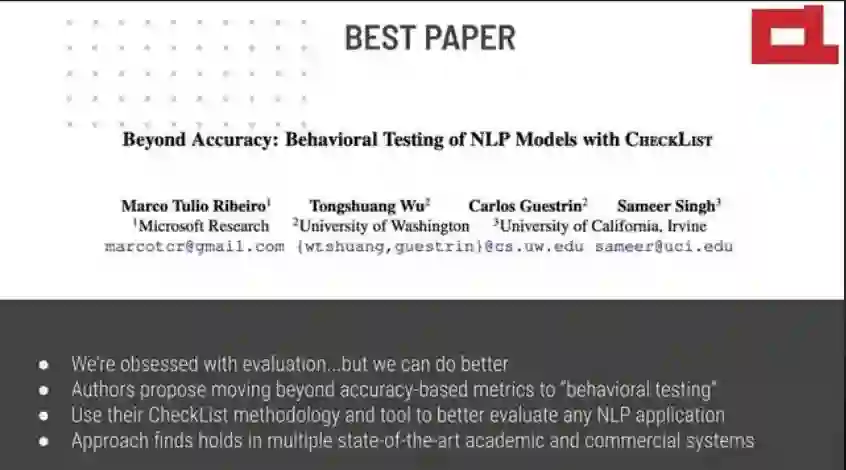 最佳论文:《Beyond Accuracy: Behavioral Testing of NLP Models with CheckList》