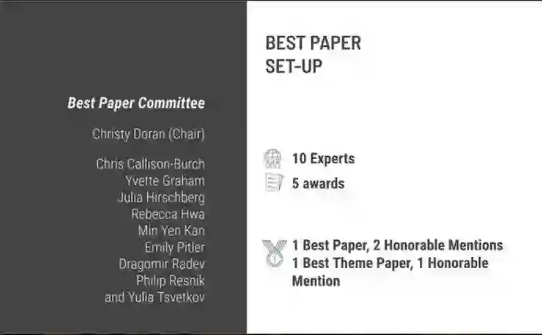 今天,ACL2020的论文奖项已全部出炉,共八篇文章获奖,包含一篇最佳论文、两篇最佳论文荣誉提名、一篇最佳主题论文、一篇主题论文荣誉提名、一篇最佳 Demo 论文、两篇最佳Demo荣誉提名。
