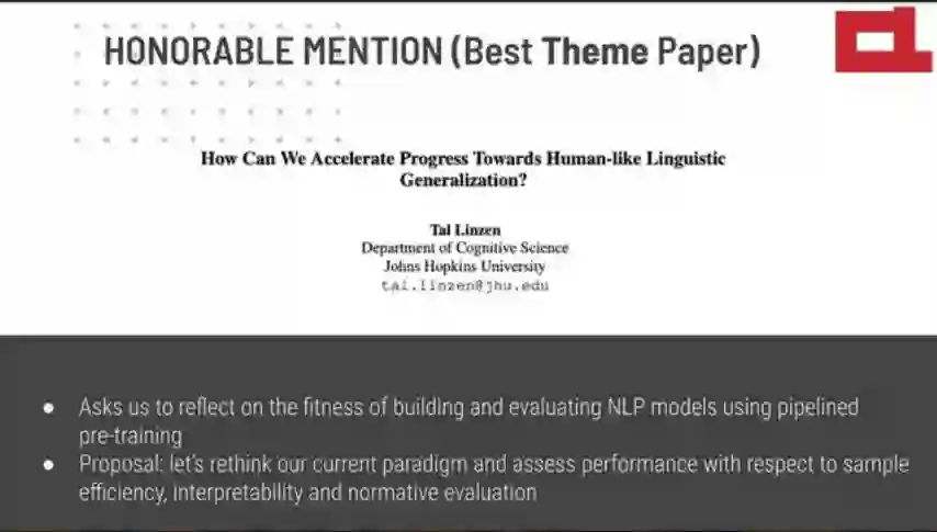 最佳主题论文荣誉提名:《How Can We Accelerate Progress Towards Human-like Linguistic Generalization?》(我们怎样才能加速向“类人类”语言泛化的进程?)