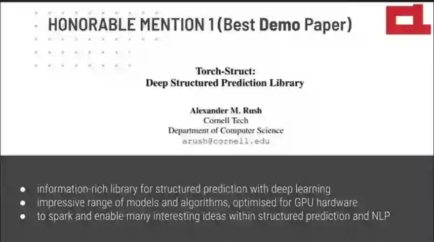 最佳DEMO论文荣誉提名一:《Torch-Struct: Deep Structured Prediction Library》(Torch结构:深层结构预测库)