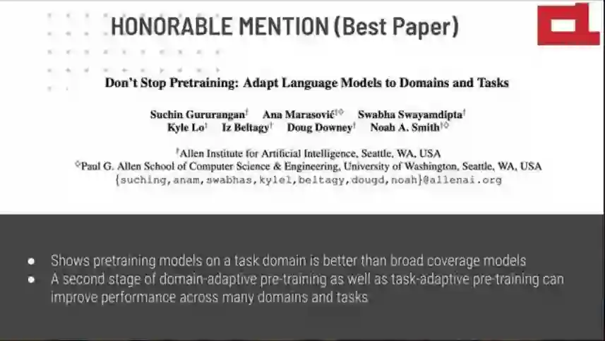 最佳论文荣誉提名一:《Don’t Stop Pretraining: Adapt Language Models to Domains and Tasks》(不要停止预训练:使语言模型适应不同领域和任务)