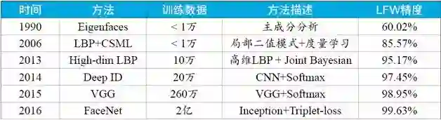 2014年前后,随着大数据和深度学习的发展,神经网络重受瞩目,并在图像分类、手写体识别、语音识别等应用中获得了远超经典方法的结果。香港中文大学的Sun Yi等人提出将卷积神经网络应用到人脸识别上[7],采用20万训练数据,在LFW上第一次得到超过人类水平的识别精度,这是人脸识别发展历史上的一座里程碑。自此之后,研究者们不断改进网络结构,同时扩大训练样本规模,将LFW上的识别精度推到99.5%以上。如表1所示,我们给出了人脸识别发展过程中一些经典的方法及其在LFW上的精度,一个基本的趋势是:训练数据规模越来越大,识别精度越来越高。如果读者阅读有兴趣了解人脸识别更细节的发展历史,可以参考文献[8][9]。