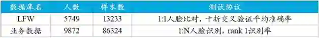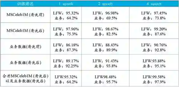 表2给出了本文用到的训练数据集,其中前3个是当前最主流的公开训练数据集,最后一个为私有业务数据集。表3出给了性能验证的两个数据集及测试协议,其中LFW是目前最主流的非受限人脸识别公开竞赛。我们注意到,大多数训练集都有较大噪声,如果不进行相应清洗操作,则训练会较难收敛。本文给出了一种快速可靠的数据清洗方法,如表4所示。
