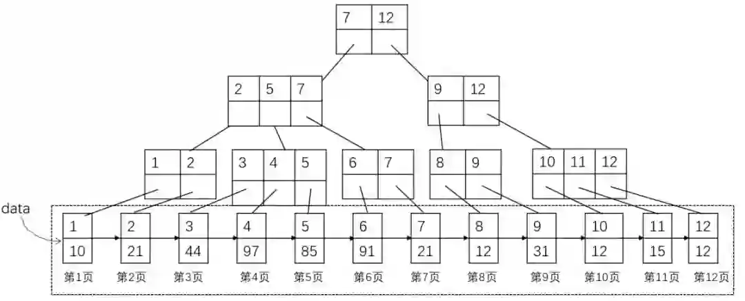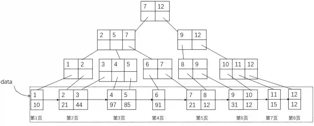 最后一层为有序的数据页,每个页包含指向下一个数据页的页号(也就是地址),这里假设一条记录占据一个数据页,那么第一条记录在1号数据页,第二条记录在2号数据页,依次类推。