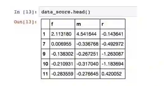 上图的三列数据是经过标准化后的用户消费数据。值越接近0,说明离平均水平越近。r值因为是最近一次消费时间,所以值越小,说明时间越接近,值越大,说明消费越久远。