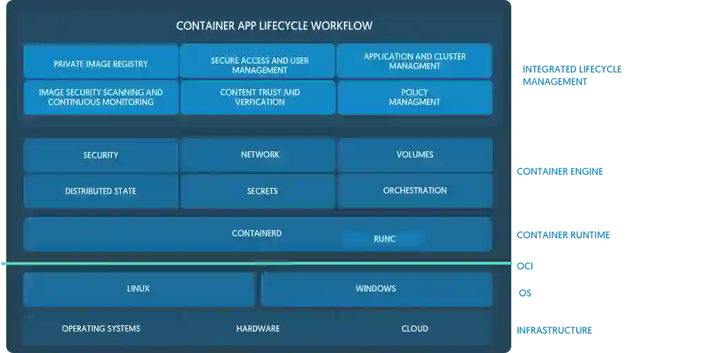 这张图强调了 OCI 规范提供了一个由容器运行时实现的标准层:containerd 和 runc。 要组装一个完整的像 Docker 这样具有完整容器生命周期和工作流程的容器平台,需要和许多其他的组件集成在一起:管理基础架构的 InfraKit,提供操作系统的 LinuxKit,交付编排的 SwarmKit,确保安全性的 Notary。