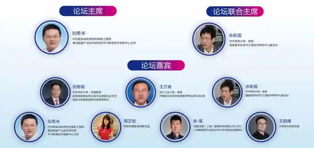 以“智慧无界,‘育’见未来”为主题的智慧教育平行论坛,由中科院自动化研究所高级工程师、青岛智能产业技术研究院平行教育技术创新中心主任刘希未任论坛主席,华中师范大学教授、国家数字化学习工程技术研究中心副主任余新国任论坛联合主席,邀请浙江工业大学教授、中国自动化学会智慧教育专业委员会主任王万良,华中师范大学教授、国家数字化学习工程技术研究中心副主任余新国,网易有道教育战略总监周芷旭,塔普翊海(上海)智能科技有限公司CEO、上海物联网行业协会AR/VR专委会副理事长余海等多位教育领域的知名学者、行业专家和业界精英作主题报告,分享人工智能在教育领域的最新科研成果和应用案例,旨在深入探讨如何实现信息技术与教育教学深度融合,针对如何构建智慧教育新范式,如何破解教育改革发展过程中困扰教与学的核心问题和难点问题,搭建智慧教育研究、交流与合作平台,携手共进,推进教育现代化发展。