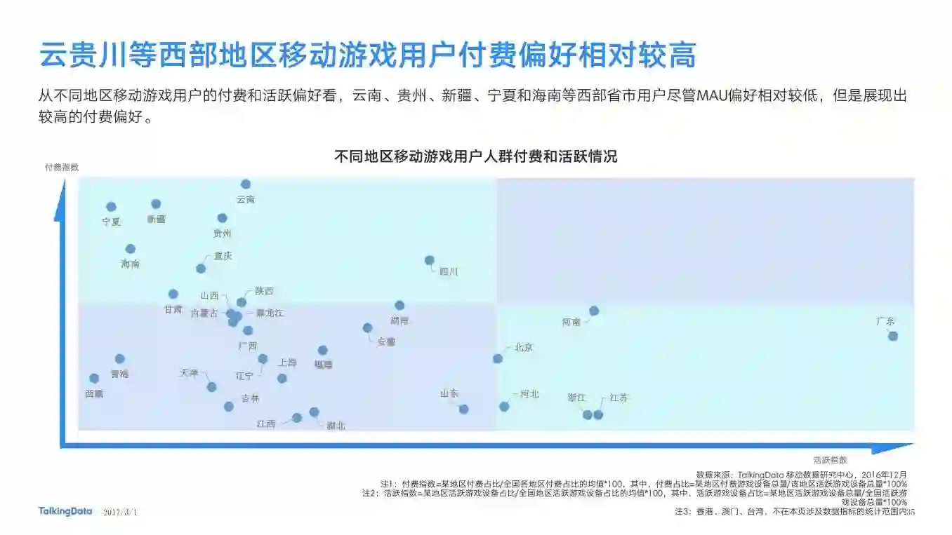 比如下面TalkingData2016年移动游戏行业白皮书显示,云贵疆(川)地区用户付费情况相对较高。