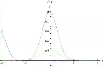 取自:Mathworld. "The green curve shows the convolution of the blue and red curves as a function of t, the position indicated by the vertical green line. The gray region indicates the product g(tau)f(t-tau) as a function of t, so its area as a function of t is precisely the convolution."