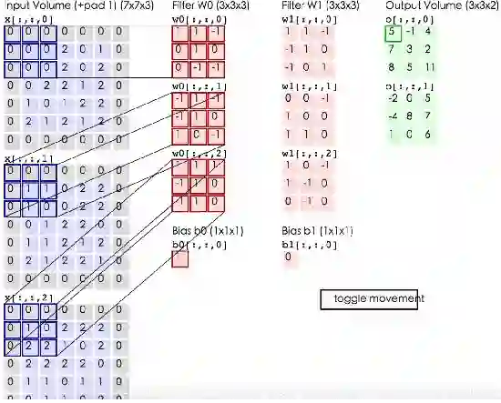 我们以输入量和输出量来描述经过卷积网络处理的图像,在数学中以多维矩阵表示为:30x30x3。每一层的维度会发生变化,原因详见下文。