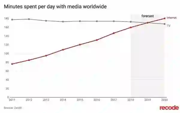 6月11日消息,最近预测机构Zenith公布了一项数据,他们认为从明年开始人们每天花在网络上的时间,将比看电视的时间更多。根据他们的预测,明年人们将平均每天有 170.6分钟花在网络上看视频、更新社交账号和购物;相比之下,人们平均每天花在看电视上的时间为 170.3分钟。