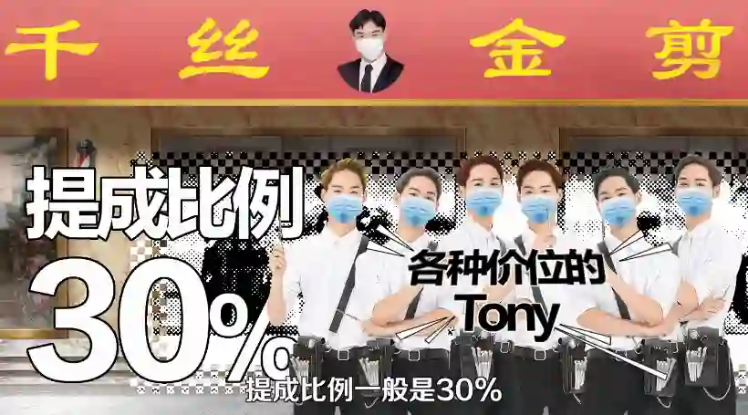 Tony们和洗头小弟的工资,占一家理发店所有成本的40%-50%左右。除了店长、合伙人,其他各种价位的Tony基本上都是拿提成,提成比例一般是30%。而这部分的钱又直接跟理发师的头衔挂钩。