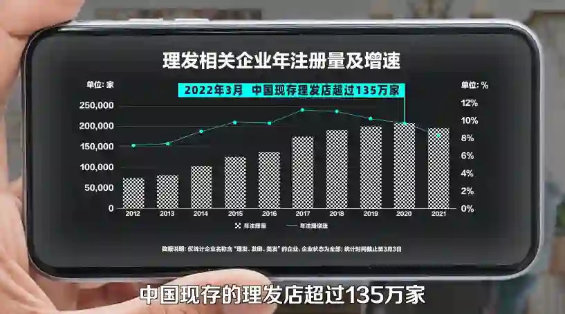 天眼查数据显示,近10年每年理发店的注册量几乎都在增加。截至2022年3月,中国现存的理发店超过135万家。现在走在任何一个社区主街道上,几乎每隔几十米就可以看到一家理发店。