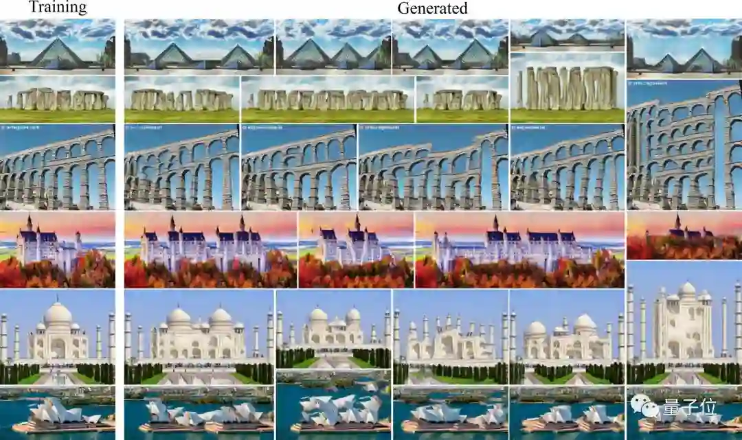 上图左侧是用来训练的单个图像,右侧是利用ConSinGAN训练后生成的复杂全局结构。