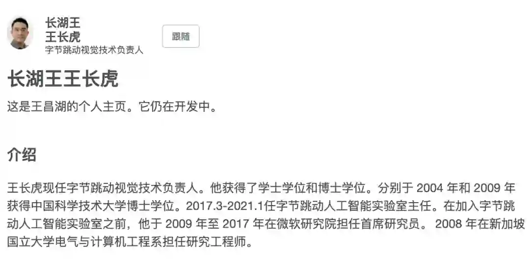 据公开资料显示,王长虎于2009年毕业于中国科学技术大学博士学位,毕业之后,担任过Microsoft亚洲研究院的主管研究员,曾在新加坡国立大学担任研究工程师。2017年加入字节跳动的人工智能实验室.