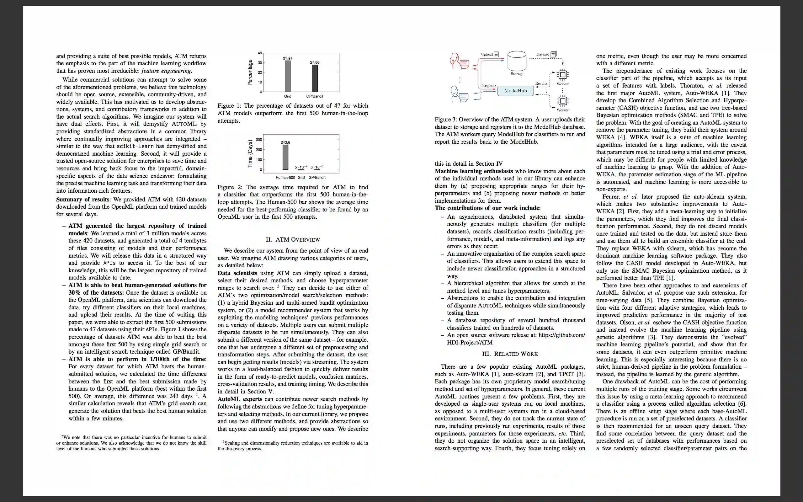 为了比较ATM与人类,研究人员将该系统与使用协作式众包平台openml.org的用户进行了一番测试。数据科学家们经常在这个平台上一起解决问题,通过完善彼此的工作来找到最佳解决方案。ATM分析了来自该平台的47个数据集,在30%的时间里获得的解决方案比人类获得的更胜一筹。就算表现并不比人类出色,也非常相近;重要的是,它运行起来比人类快得多。openml.org用户平均需要100天才能获得一种近乎完美的解决方案,而ATM不到一天就能得到与之媲美的解决方案。