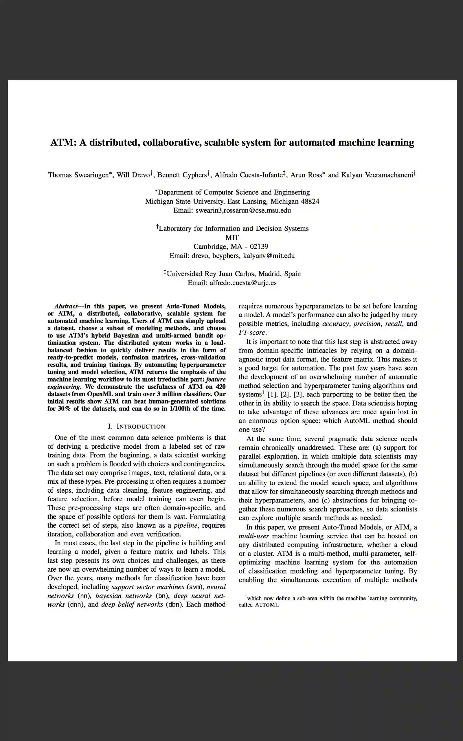 在上周的IEEE国际大数据会议上,麻省理工学院(MIT)和密歇根州立大学的研究人员发表了一篇题为《ATM:一种分布式、协作式、可扩展的自动化机器学习系统》的论文(见文末)。他们介绍了一种新系统,新系统可以使模型选择这一步实现自动化,甚至提升人类的表现。该系统名为自动调优模型(ATM),它充分利用基于云的计算资源,快速搜寻建模方案,并找到最适合某个特定问题的建模技术。它还调整优化模型的超参数(优化算法的一种方法),这有望大幅提升性能。ATM现在是一种开源平台,可供企业使用。
