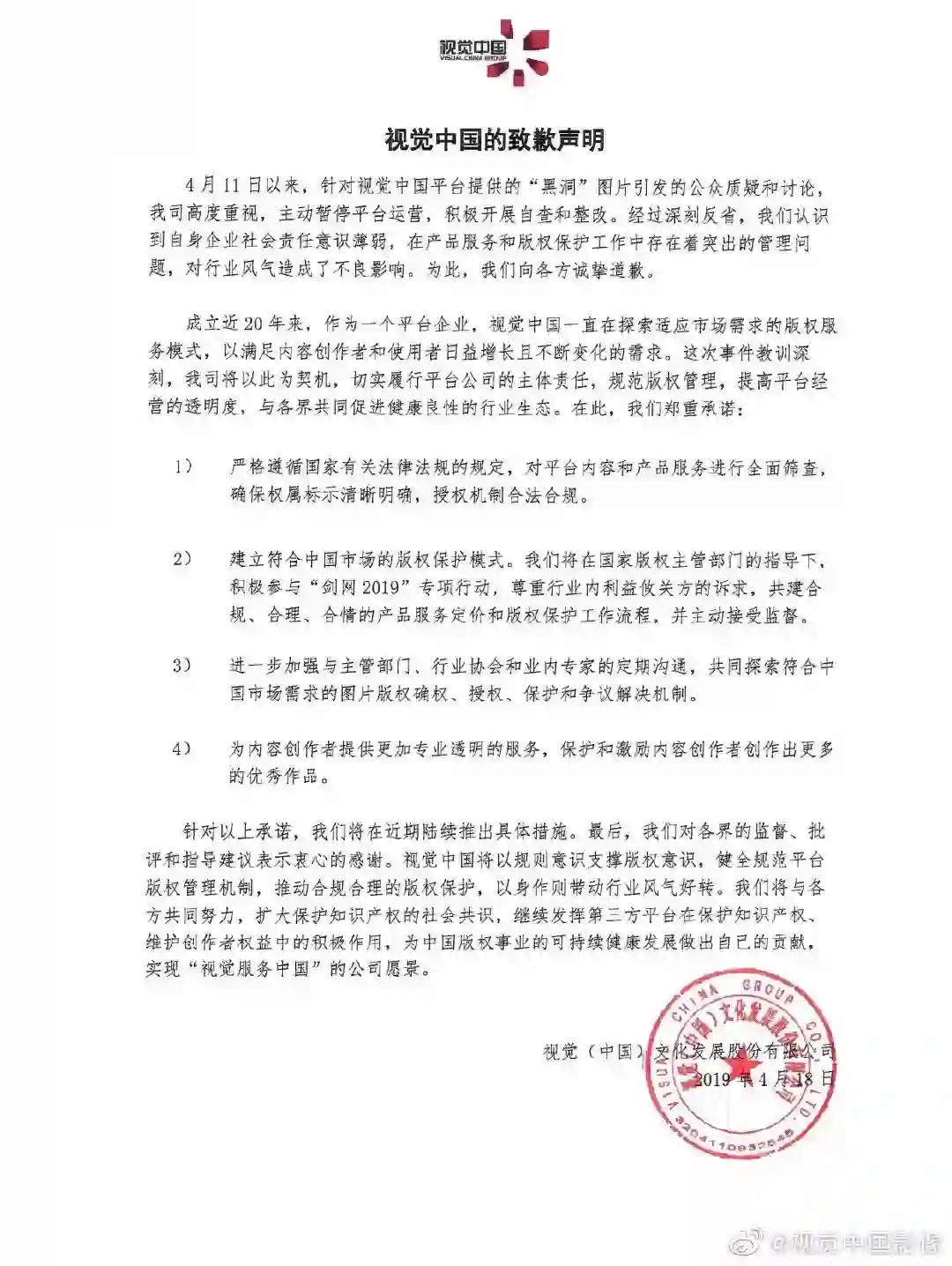 3.视觉中国再次发布致歉声明:对平台内容产品服务全面筛查
