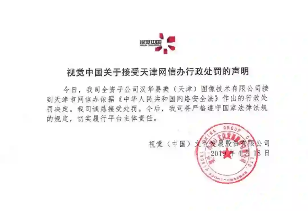 视觉中国在其官微发布关于接受天津网信办行政处罚的声明:今日,我司全资子公司汉华易美(天津)图像技术有限公司接到天津市网信办依据《中华人民共和国网络安全法》作出的行政处罚决定。我司诚恳接受处罚。今后,我司将严格遵守国家法律法规 的规定,切实履行平台主体责任。