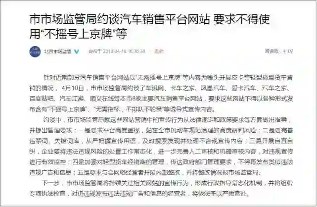 针对近期部分汽车销售平台网站以“无需摇号上京牌”等内容为噱头开展皮卡等轻型微型货车营销的情况,4月10日,北京市市场监管局约谈了车讯网、卡车之家、凤凰汽车、爱卡汽车、汽车之家、百度贴吧、汽车江湖、顺义在线等本市8家主要汽车销售平台网站,要求这些网站不得以各种形式发布含有“不摇号上京牌”、“无需指标,不排队不轮候”等诱导式宣传内容。
