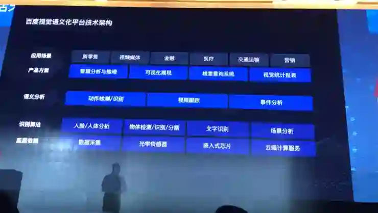 他描述了百度语义化平台的技术架构。首先是底层依赖,这里包括数据采集、光学传感器、嵌入式芯片、云端计算服务,上层是识别算法,包括人体/人脸分析、物体检测/识别/分割、文字识别、场景分析,再往上是语义分析层,包括动作检测/识别、视频跟踪、事件分析,接下来是产品方案层,包括智慧分析与推理、可视化展现等,最上层是丰富的应用场景。