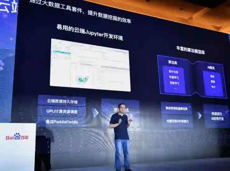 百度大数据部总监郭谢也为在场观众正式介绍百度大数据众智开放平台「点石」,其中包括三个开发工具,Datalab、预置算法库、预制模型库。
