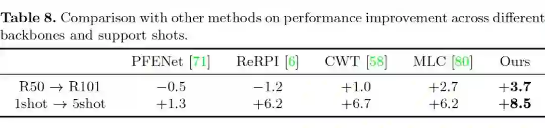 个优点是自支持算法会更加受益于更好的 backbone 和 support 数量,因为它们可以带来更准确的初始 query mask 预测结果,可以提取更准确的 self-support prototype,进而得到更好的分割结果。这是一种马太效应,因此我们的方法在 ResNet-101 backbone 和 5-shot support 的设置下会大大优于其他的算法。同时表 8 也展示了自支持算法在不同条件下的性能提升幅度。