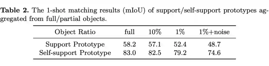 如表 1 所示,对于前景像素来说,相同物体上的前景像素之间的相似度远大于不同物体上的前景像素之间的相似度。我们在背景像素上也观察到相同的现象。但是这里验证的是像素之间的关系,而我们的目的是进行特征原型 support prototype 和查询图片特征 query feature 之间的匹配。所以我们利用另一个实验进一步验证我们的自支持想法。