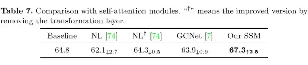 5. 表 7 讨论了自支持算法与自注意力方法的区别。