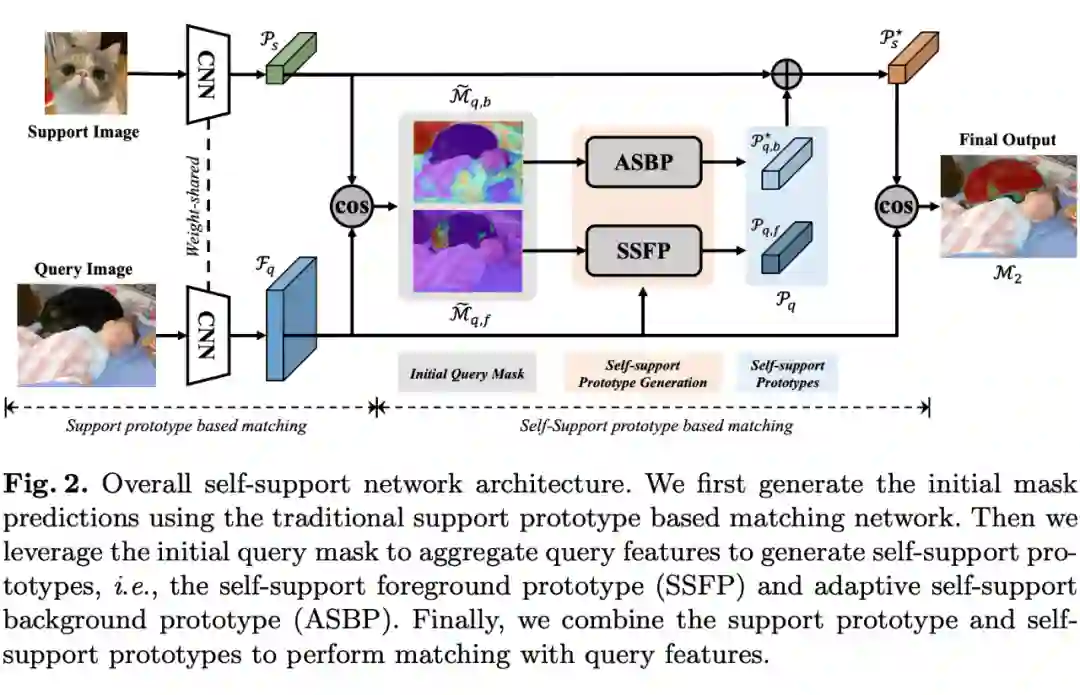 得到的,而 query prediction mask 则是由传统 support-query 匹配算法生成的。因为这种 query 特征的自匹配性质,我们将方法命名为自支持(self-support)算法。